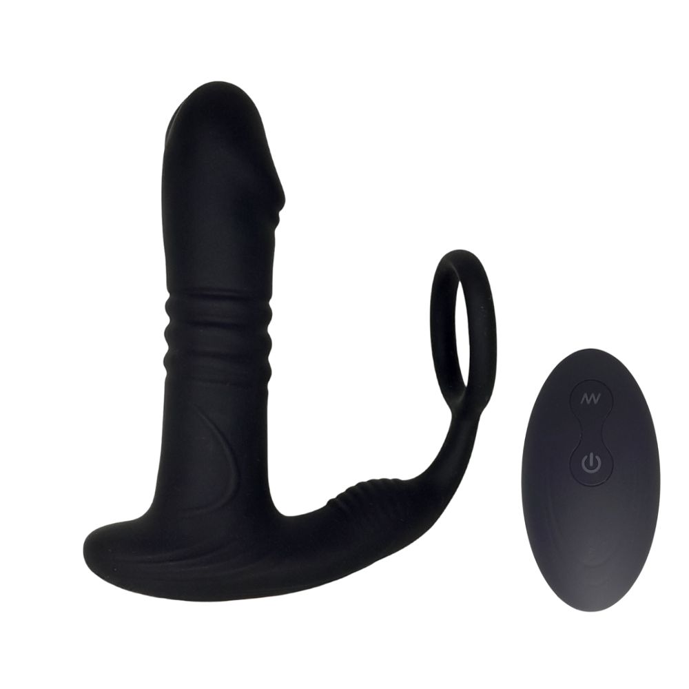 Massageador de próstata em silicone macio com anel peniano, movimentos em vai em vem e estimulação por vibração. Possui toque suave, aveludado e detalhes metalizados.
